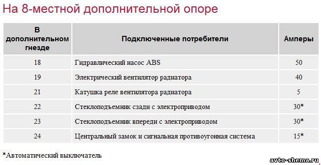 При определенной расширенной комплектации на 8-местной опоре дополнительных реле слева под приборной доской размещаются вспомогательные предохранители. При этом чаще всего речь идет о так называемых термопредохранителях. Это предохранители, которые при перегрузке электрической цепи на определенное время прерывают поток тока, а затем снова восстанавливают соединение.