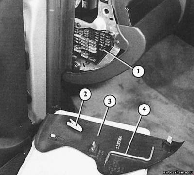 Внутри в облицовке (3) левой торцевой стороны приборной доски в зажиме находятся маленькие пластмассовые щипцы (2) для того, чтобы вынимать предохранители, и кривошип (4) для аварийного управления раздвижной крышей. На рисунке внизу показано размещение предохранителей в коробке (1)