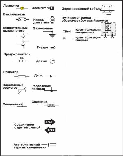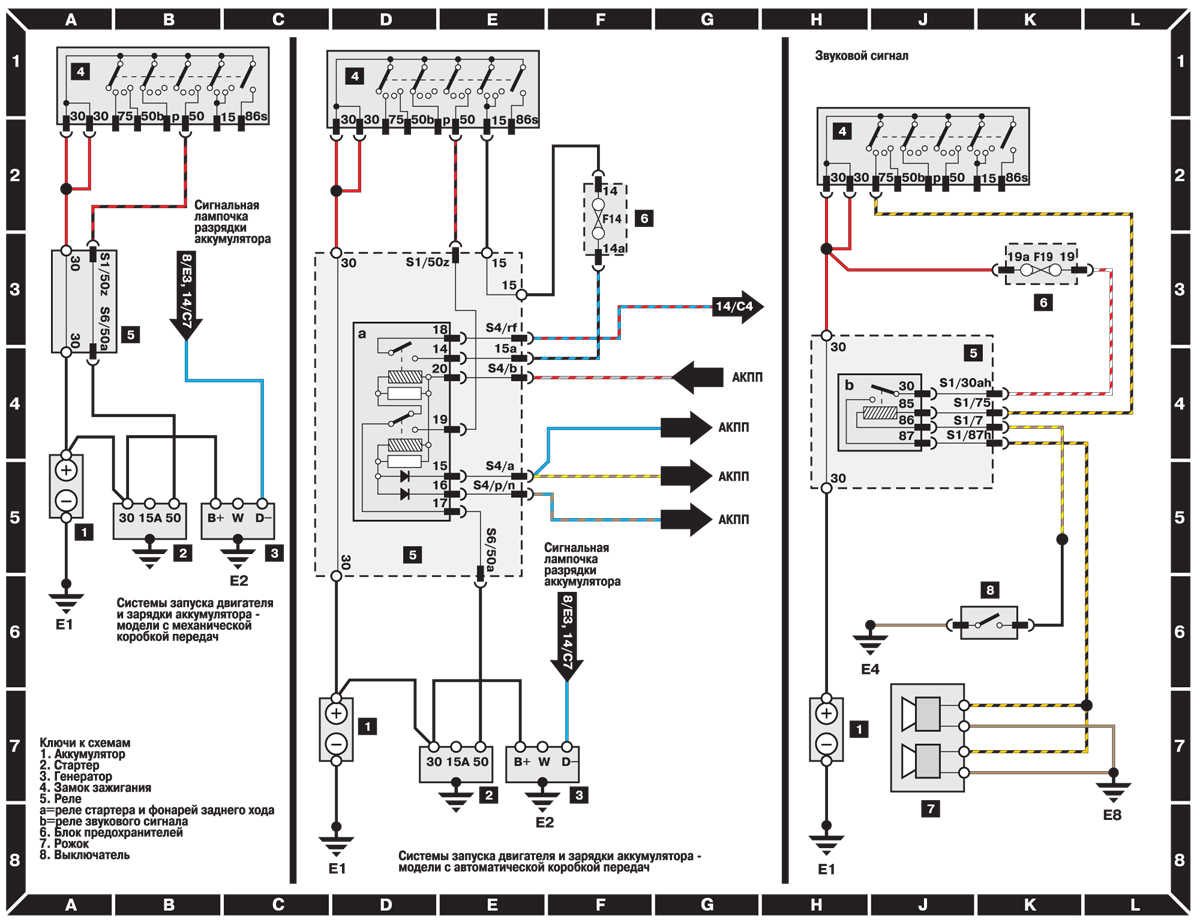 Схема системы запуска двигателя, зарядки аккумулятора и звукового сигнала