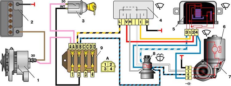 7 – термобиметаллический предохранитель; 8 – выключатель стеклоочистителя, расположенный в насосе омывателя ветрового стекла;