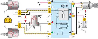 5 – выключатель омывателя ветрового стекла в трехрычажном переключателе (одновременно является выключателем омывателя фар); Р2 – реле включения очистителей и омывателя фар;