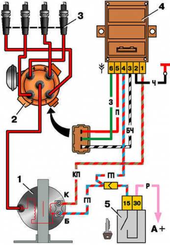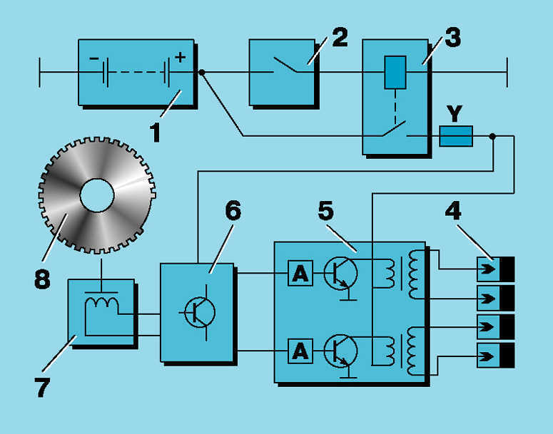 5 – контроллер (с 2000 года выпускается модификация системы с контроллерами М1.5.4N или «Январь-5.1») 19 – датчик детонации