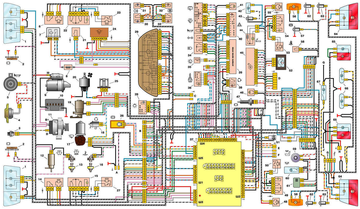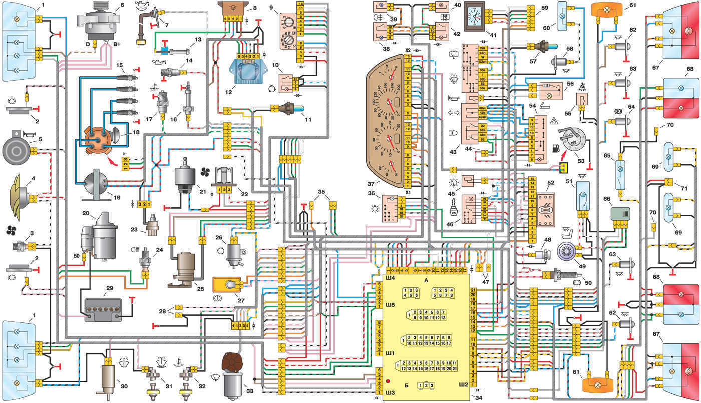 8 – блок управления электромагнитным клапаном карбюратора 44 – колодка для переключения проводов при установке блок-фар другого типа