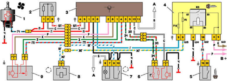 4 – электродвигатель вентилятора системы охлаждения двигателя 40 – контрольная лампа обогрева заднего стекла