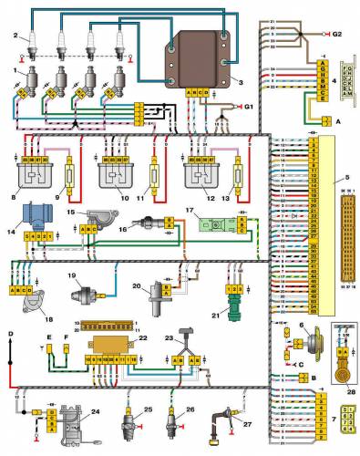 14 – датчик массового расхода воздуха 28 – датчик детонации (устанавливается на автомобилях с модифицированной системой управления)