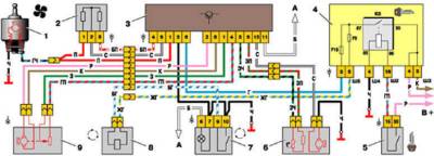 7 — реле включения электростеклоподъемников 41 — лампа освещения рычагов управления отопителем