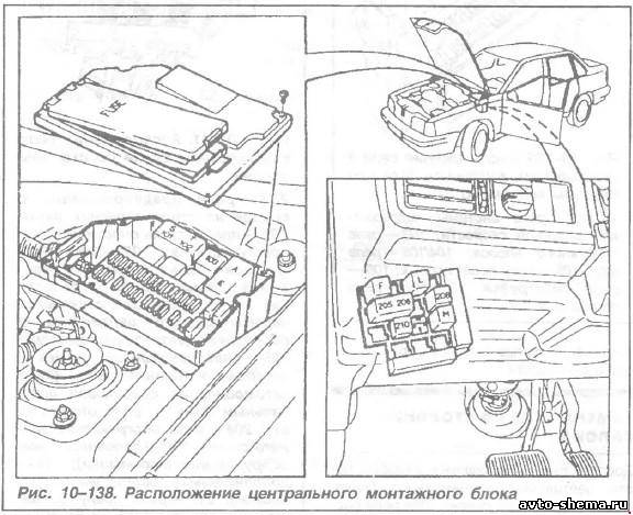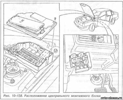 Центральный монтажный блок состоит из трех частей (рис. 10-138): одна содержит предохранители, другая — реле (доступ к которым обеспечивается со стороны моторного отсека) и еще одна также реле (доступ к которым обеспечивается под приборной панелью).