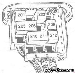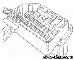 Расположение реле в центральном монтажном блоке со стороны моторного отсека: 101/102—реле системы поддержания заданной скорости; 103—реле топливного насоса; 104/108—реле фар; 105—реле перегрузки X; 106— реле перегрузки 15; 107 — реле перегрузки 15i