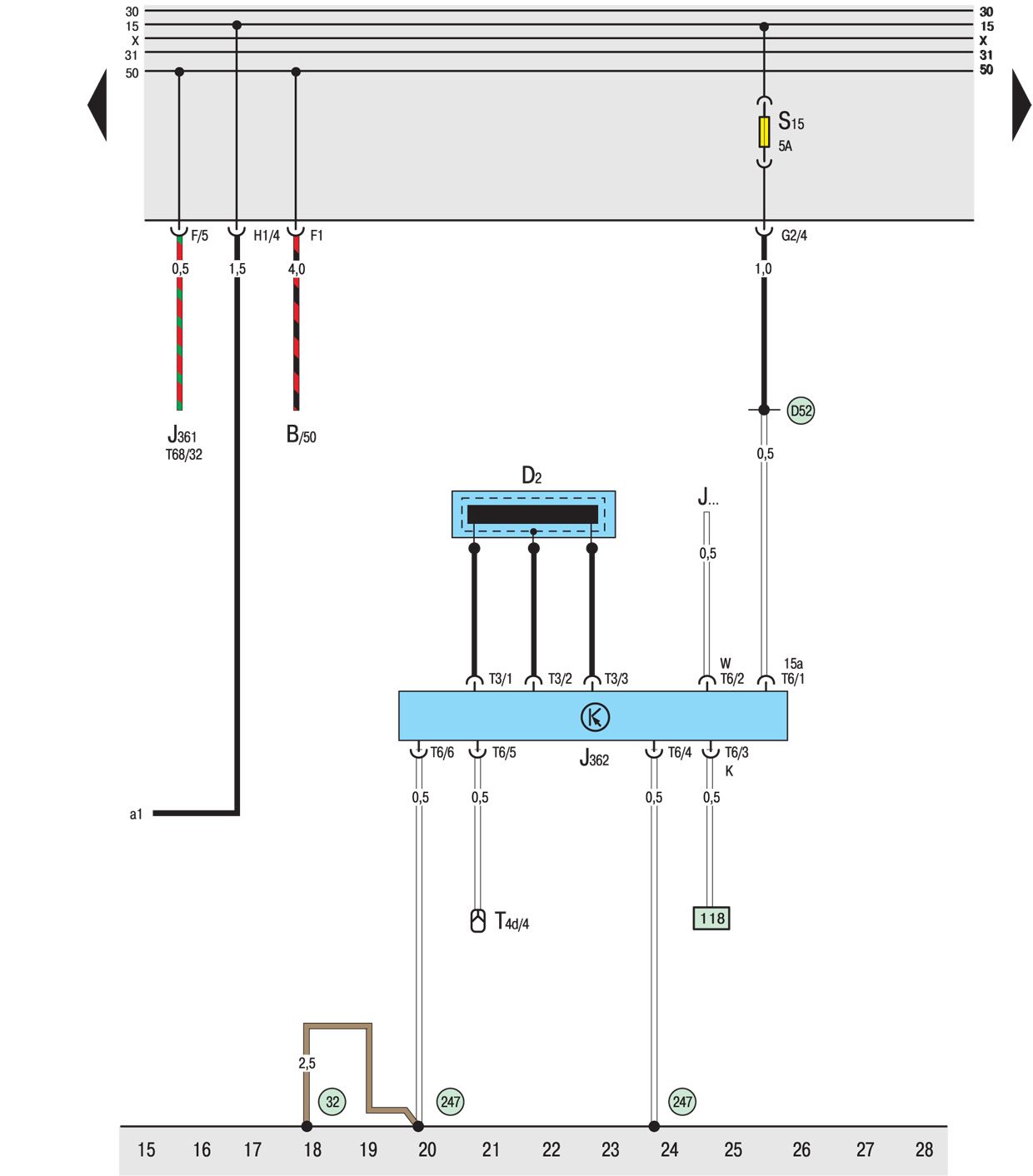 D52 Положительное соединение (15a), в жгуте проводов моторного отсека двигателя