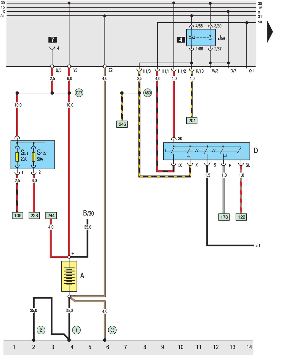 A1 Положительное соединение (30a) в жгуте проводов панели приборов