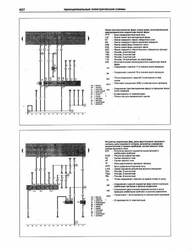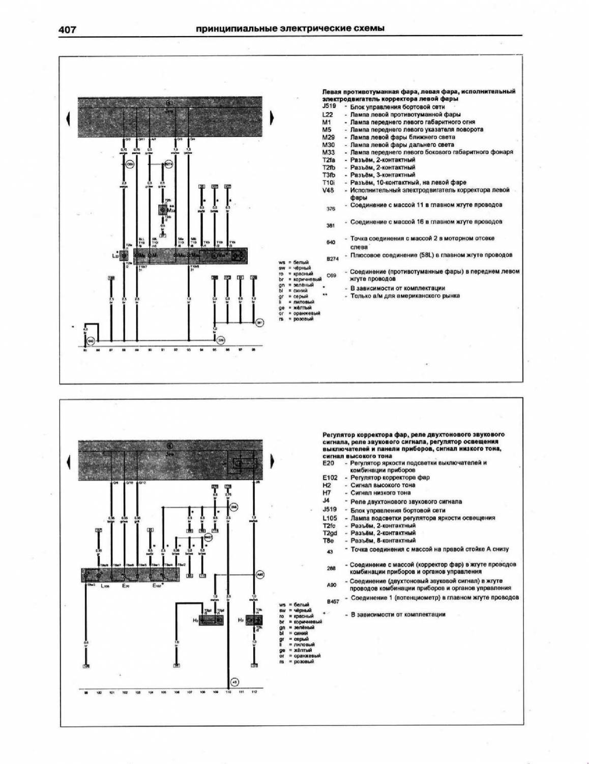 Электросхема правой противотуманной фары, правой фары, корректора правой фары, переключателя освещения и выключателя противотуманных фар