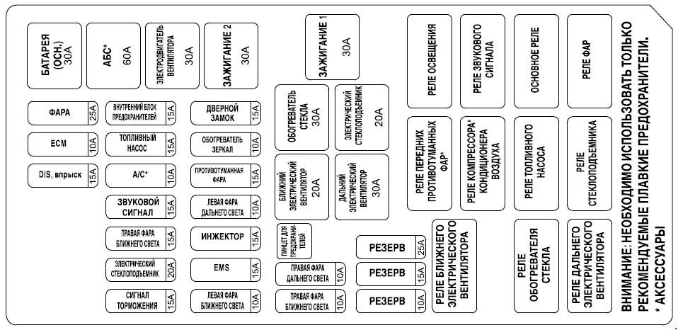 Не все описания блоков предохранителей, содержащиеся в данной статье, применимы к блокам предохранителей Вашего транспортного средства. Осмотрев блок предохранителей транспортного средства, см. этикетку, расположенную на блоке предохранителей.