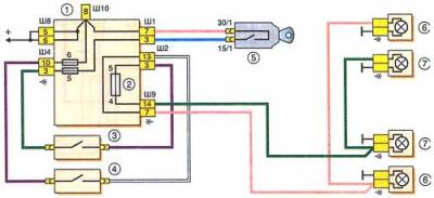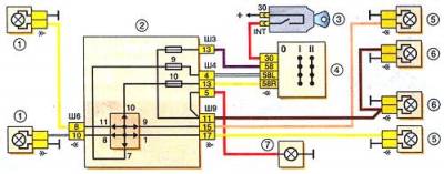 1 — монтажный блок; 2 — перемычка; 3 — выключатель фонарей заднего хода; 4 — выключатель стоп-сигналов; 5 — выключатель зажигания; 6 — лампы стоп-сигналов; 7 — лампы фонарей заднего хода.