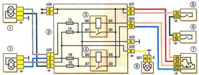 1 — лампы ближнего/дальнего света в блок-фарах; 2 — монтажный блок; 3 — реле включения дальнего света фар; 4 — реле включения ближнего света фар; 5 — выключатель зажигания; 6 — выключатель наружного освещения; 7 — переключатель света фар; 8 — контрольная лампа включения дальнего света фар.