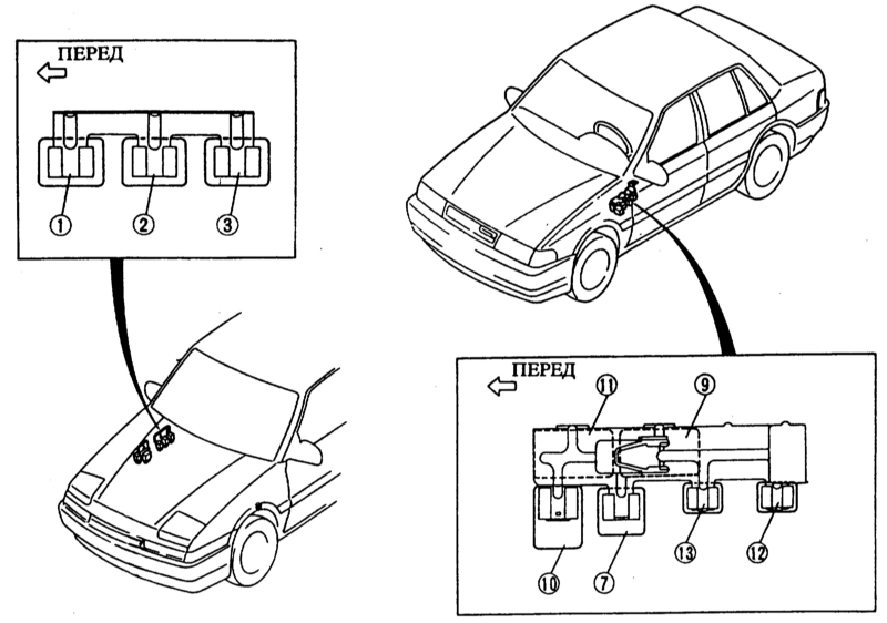 (f) — передний кабельный жгут в панели приборов и в правом двигательном отсеке.