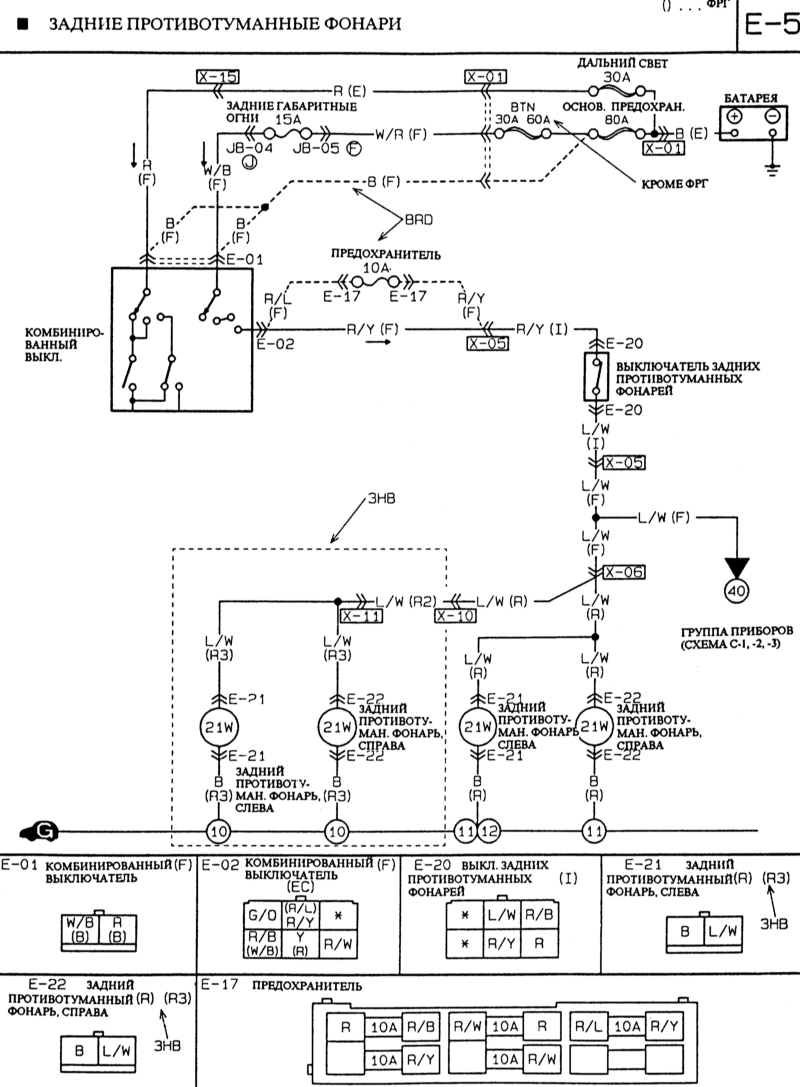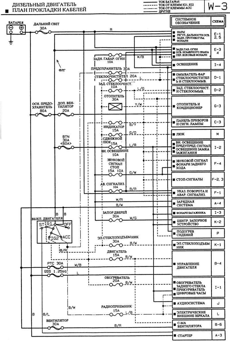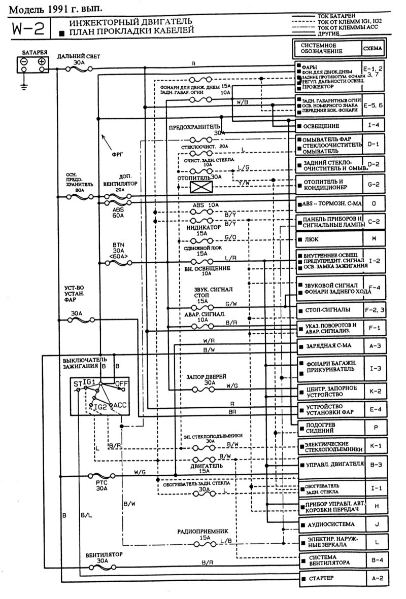 w/r обозначает белый кабель с красной полоской. Состоящая рядом буква в скобках служит для обозначения соответствующего кабельного жгута.