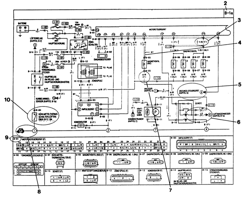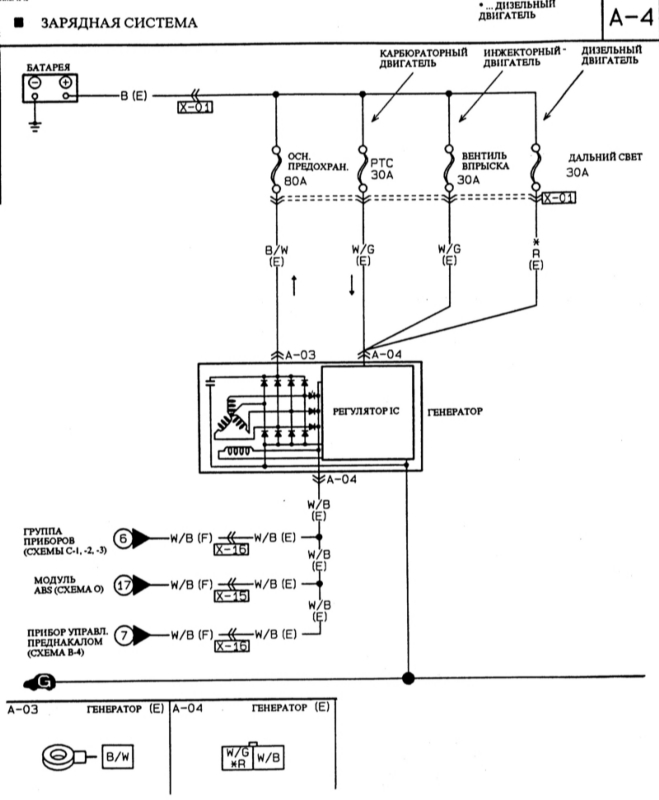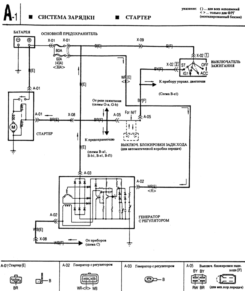 Принципиальные схемы электрооборудования, на Mazda 323 1985-1993 г.в. Рулевой механизм расположен слева от двигателя и соединен с рулевыми рычагами посредством тяг. Некоторые модели оснащены гидроусилителем руля. Тормозная система состоит из главного торомозного цилиндра, тормозного усилителя, дисковых тормозов передних колес и барабанных тормозов задних колес. У некоторых моделей дисковые тормоза установлены также и на задних колесах. В зависимости от модели Mazda 323 с 10/89 г. вып. может быть оснащена антиблокировочной системой ABS.