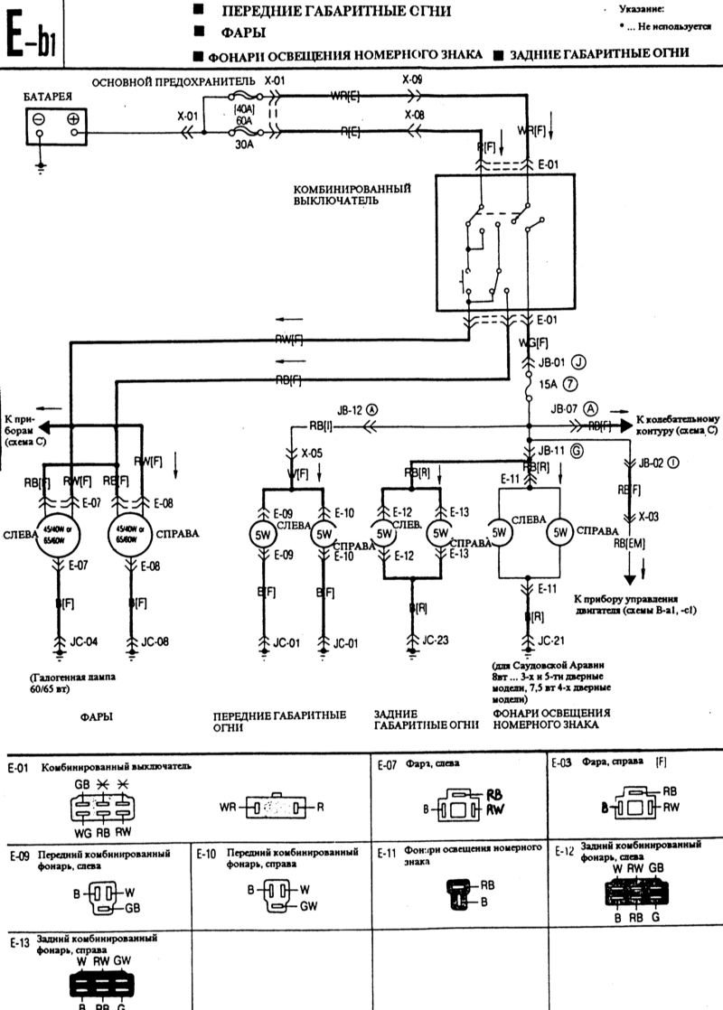 Передние габаритные огни. Фары. Фонари освещения номерного знака. Задние габаритные огни — эл.схема