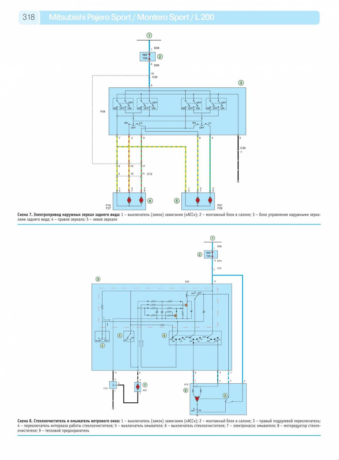 Электросхема привода наружных зеркал заднего вида и стеклоочиститель и омыватель ветрового стекла