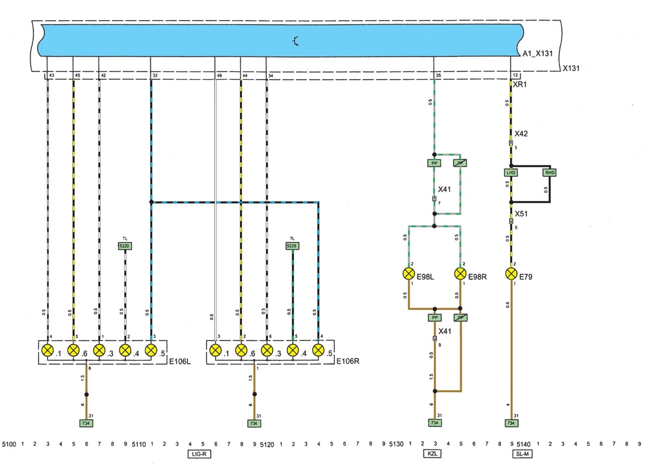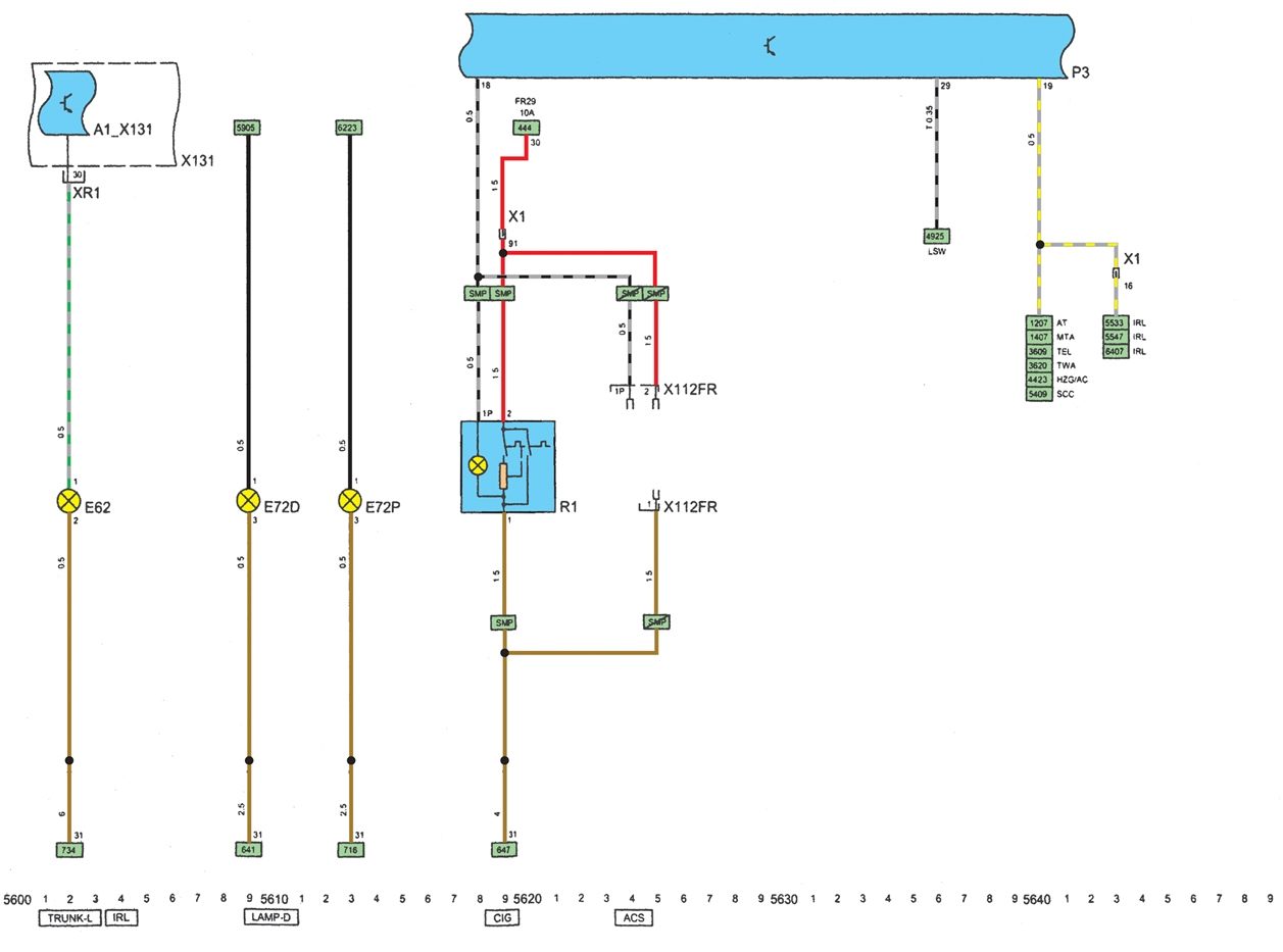 Электросхема задних комбинированных фонарей/Подссветки номерного знака/Стоп-сигнала верхнего уровня