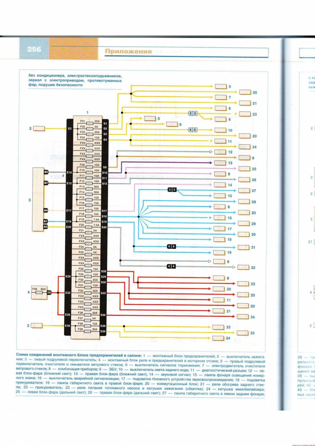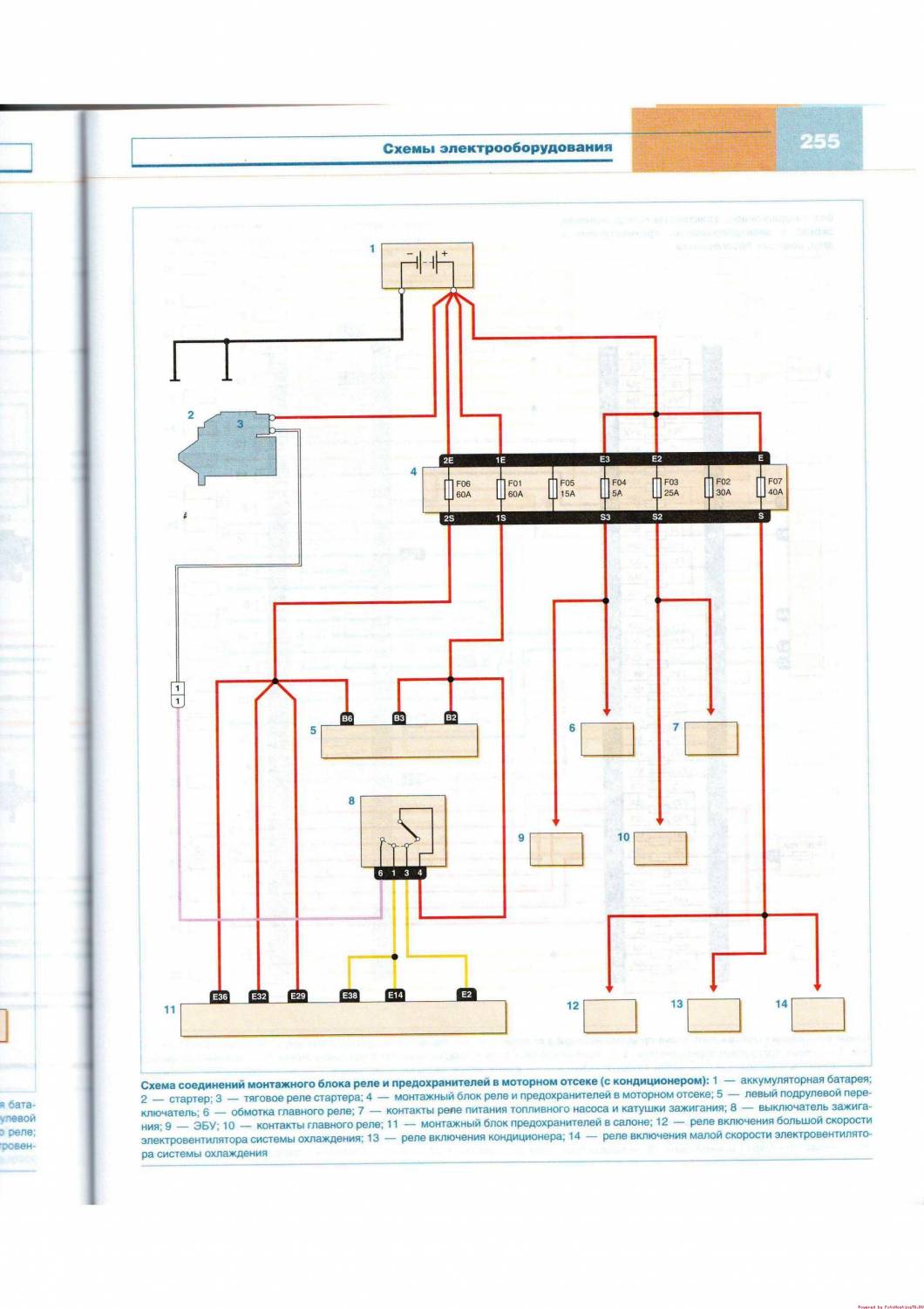 Электросхема соединений монтажного блока реле и предохранителей в моторном отсеке без/с кондиционером на Рено Логан