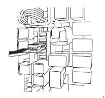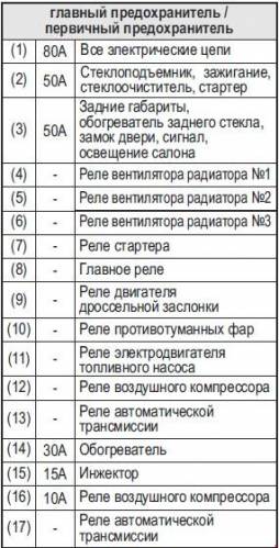 В моторном отсеке расположен главный предохранитель, первичные предохранители и некоторые вторичные предохранители. При перегорании главного предохранителя обесточивается все электрооборудование автомобиля. При перегорании первичного предохранителя отключаются все электрооборудование, принадлежащее соответствующей группе. Для замены главного, первичных и вторичных предохранителей используйте фирменные запасные предохранители SUZUKI. Для извлечения предохранителя воспользуйтесь специальным съемником, предусмотренным в блоке предохранителей. Номинальный ток каждого предохранителя указан на крышке блока предохранителей.