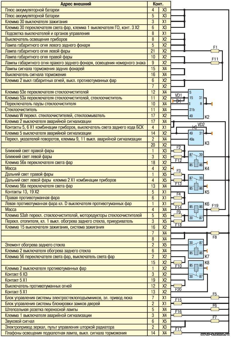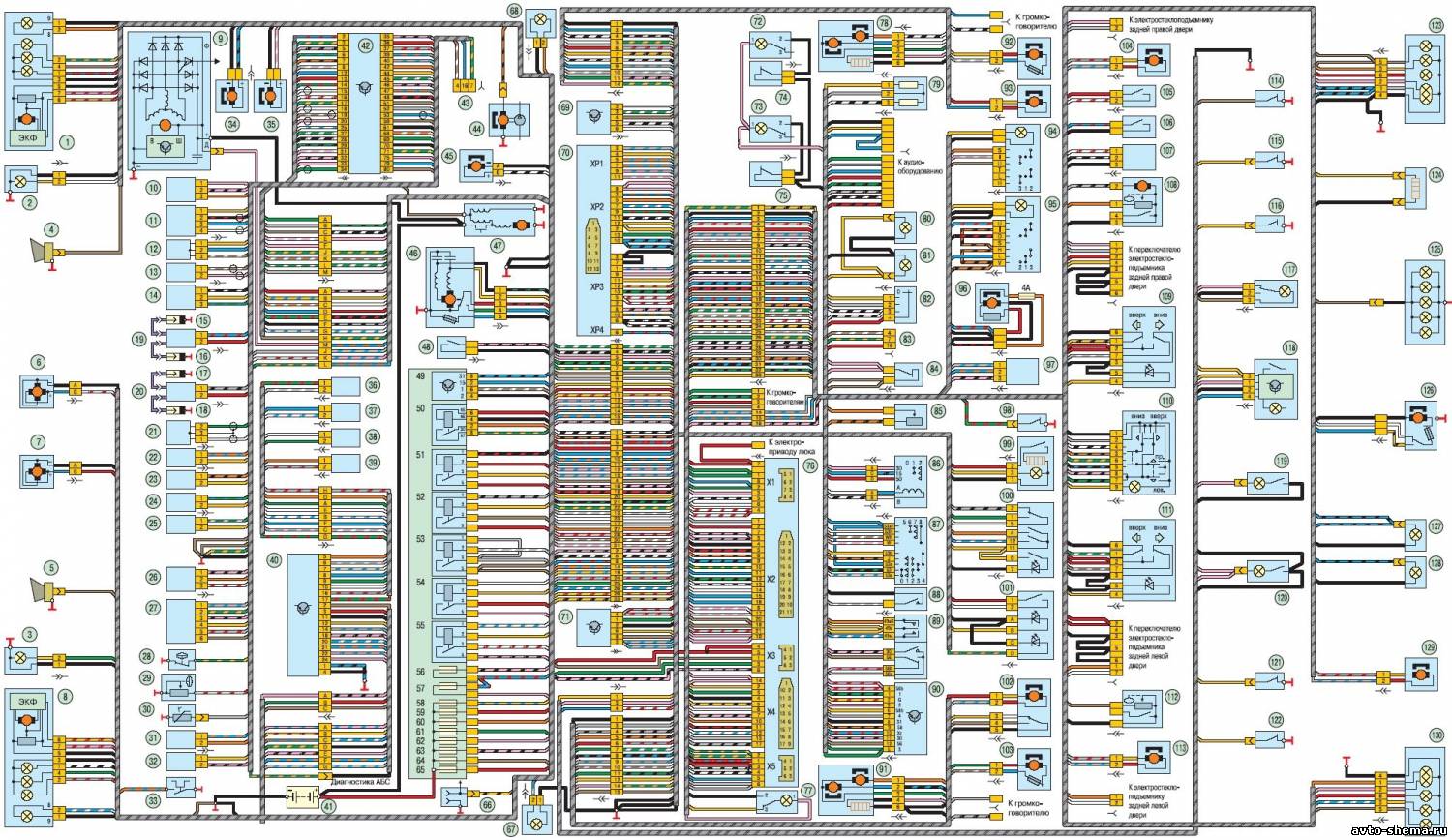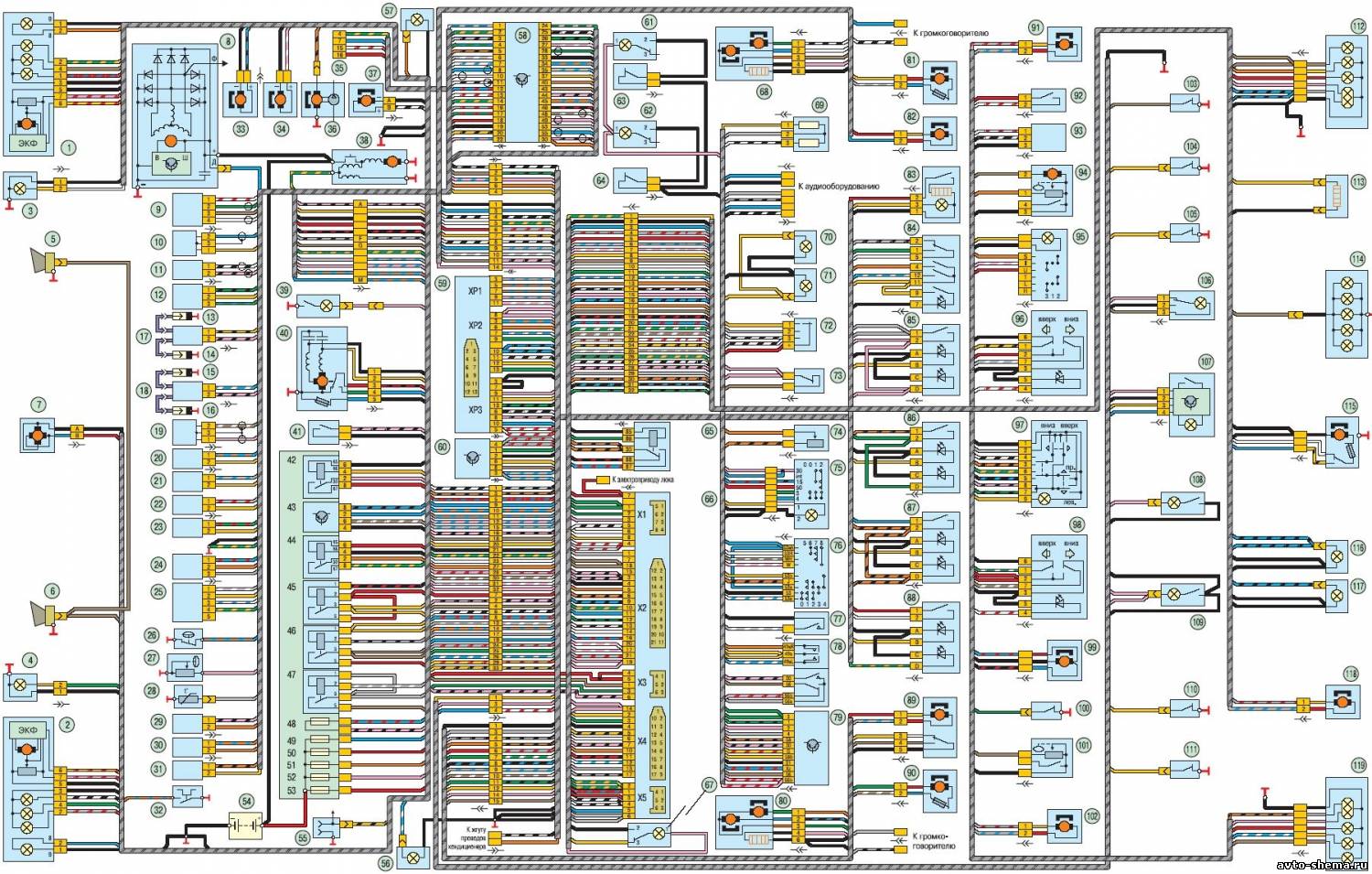 1, 2 — блок-фары; 3, 4 — противотуманные фары; 5, 6 — звуковые сигналы; 7 — электровентилятор системы охлаждения двигателя; 8 — генератор; 9 — датчик концентрации кислорода; 10 — датчик положения распределительного вала (датчик фазы); 11 — датчик детонации; 12 — регулятор холостого хода; 13, 14, 15, 16 — свечи зажигания; 17, 18 — катушки зажигания; 19 — датчик положения коленчатого вала; 20, 21, 22, 23 — топливные форсунки; 24 — датчик положения дроссельной заслонки; 25 — датчик массового расхода воздуха; 26 — датчик сигнальной лампы аварийного падения давления масла; 27 — датчик указателя давления масла; 28, 30 — датчик температуры охлаждающей жидкости; 29 — датчик температуры воздуха; 31 — электромагнитный клапан адсорбера; 32 — датчик сигнальной лампы аварийного перегрева охлаждающей жидкости; 33, 34 — насосы омывателей ветрового стекла и стекла двери задка; 35 — колодка диагностики; 36 — электродвигатель водяного насоса; 37 — электродвигатель вентилятора отопителя; 38 — стартер; 39 — фонарь освещения подкапотного пространства; 40 — моторедуктор очистителя ветрового стекла; 41 — выключатель сигнальной лампы аварийного состояния тормозной системы; 42 — реле электровентилятора; 43 — реле включения омывателя стекла двери задка; 44 — реле стартера; 45 — реле системы управления двигателем; 46 — реле электробензонасоса; 47 — реле включения звуковых сигналов; 48, 49, 50, 51, 52, 53 — штыревые предохранители; 54 — аккумуляторная батарея; 55 — розетка для переносной лампы; 56 — левый боковой указатель поворота; 57 — правый боковой указатель поворота; 58 — контроллер системы управления двигателем; 59 — комбинация приборов; 60 — блок управления моторедукторами замков дверей; 61, 62 — плафоны освещения вещевых ящиков; 63, 64 — магнитные выключатели плафонов освещения вещевых ящиков; 65 — реле переключения режимов отопителя; 66 — монтажный блок, расположенный в салоне автомобиля; 67 — плафон подсветки монтажного блока; 68 — зеркало заднего вида правое; 69 — добавочный резистор электродвигателя вентилятора отопителя; 70, 71 — лампы подсветки блока управления отопителем; 72 — переключатель скорости работы электродвигателя вентилятора отопителя; 73 — выключатель стоп-сигналов; 74 — регулятор длительности паузы работы стеклоочистителя; 75 — выключатель (замок) зажигания; 76 — переключатель очистителя и омывателя ветрового стекла и стекла двери задка; 77 — выключатель звуковых сигналов; 78 — переключатель указателей поворота и света фар; 79 — модуль управления светотехникой; 80 — зеркало заднего вида левое; 81 — электростеклоподъемник правой передней двери; 82 — моторедуктор замка правой передней двери; 83 — прикуриватель; 84 — выключатель аварийной сигнализации; 85 — выключатель обогрева зеркал заднего вида; 86 — переключатель отопителя; 87 — переключатель режимов работы дополнительного отопителя; 88 — выключатель обогревателя стекла двери задка; 89 — моторедуктор замка левой передней двери; 90 — электростеклоподъемник левой передней двери; 91 — моторедуктор замка правой задней двери; 92 — выключатель света заднего хода; 93 — датчик скорости; 94 — электробензонасос с датчиком уровня топлива правого бака; 95 — переключатель датчиков указателя уровня топлива; 96 — переключатель стеклоподъемника правой передней двери; 97 — пульт управления наружными зеркалами; 98 — переключатель стеклоподъемника левой 