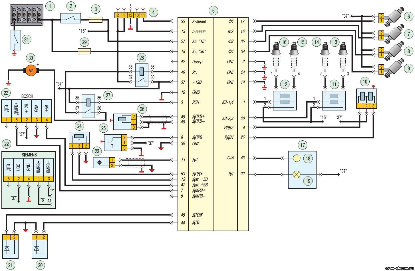 1 — аккумуляторная батарея; 2 — выключатель (замок) зажигания; 3, 29 — плавкие предохранители; 4 — диагностическая колодка; 5 — электронный блок управления двигателем; 6, 7, 8, 9 — топливные форсунки; 10 — регулятор холостого хода; 11, 12 — катушки зажигания; 13, 14, 15, 16 — свечи зажигания; 17 — комбинация приборов; 18 — тахометр; 19 — сигнальная лампа <ПРОВЕРЬТЕ ДВИГАТЕЛЬ>; 20 — датчик температуры воздуха во впускной трубе; 21 — датчик температуры охлаждающей жидкости; 22 — датчик массового расхода воздуха; 23 — датчик детонации; 24 — датчик положения дроссельной заслонки; 25 — датчик положения распределительного вала; 26 — датчик положения коленчатого вала; 27 — реле топливного насоса; 28 — главное реле системы управления двигателем; 30 — топливный насос; 31 — выключатель <массы>