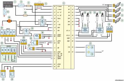 1, 8 — блок-фары; 2, 3 — противотуманные фары; 4, 5 — звуковые сигналы; 6, 7 — электровентиляторы системы охлаждения двигателя; 9 — генератор; 10 — датчик неровной дороги; 11 — датчик концентрации кислорода; 12 — датчик положения распределительного вала (датчик фазы); 13 — датчик детонации; 14 — регулятор холостого хода; 15, 16, 17, 18 — свечи зажигания; 19, 20 — катушки зажигания; 21 — датчик положения коленчатого вала; 22, 23, 24, 25 — топливные форсунки; 26 — датчик положения дроссельной заслонки; 27 — датчик массового расхода воздуха; 28 — датчик сигнальной лампы аварийного падения давления масла; 29 — датчик указателя давления масла; 30, 31 — датчик температуры охлаждающей жидкости; 32 — электромагнитный клапан адсорбера; 33 — датчик сигнальной лампы аварийного перегрева охлаждающей жидкости; 34, 35 — насосы омывателей ветрового стекла и стекла двери задка; 36 — задний левый датчик скорости; 37 — задний правый датчик скорости; 38 — передний правый датчик скорости; 39 — передний левый датчик скорости; 40 — блок управления антиблокировочной системой тормозов; 41 — аккумуляторная батарея; 42 — контроллер системы управления двигателем; 43 — колодка диагностики; 44 — электродвигатель водяного насоса; 45 — электродвигатель вентилятора отопителя; 46 — моторедуктор очистителя ветрового стекла; 47 — стартер; 48 — выключатель сигнальной лампы аварийного состояния тормозной системы; 49 — реле включения омывателя стекла двери задка; 50 — реле стартера; 51 — реле системы управления двигателем; 52 — реле электробензонасоса; 53 — реле включения звуковых сигналов; 54, 55 — реле включения электровентилятора; 56, 57, 58, 59, 60, 61, 62, 63, 64, 65 — штыревые предохранители; 66 — розетка для переносной лампы; 67 — левый боковой указатель поворота; 68 — правый боковой указатель поворота; 69 — иммобилизатор; 70 — комбинация приборов; 71 — блок управления моторедукторами замков дверей; 72, 73 — плафоны освещения вещевых ящиков; 74, 75 — магнитные выключатели плафонов освещения вещевых ящиков; 76 — монтажный блок, расположенный в салоне автомобиля; 77 — плафон подсветки монтажного блока; 78 — правое зеркало заднего вида; 79 — добавочный резистор электродвигателя вентилятора отопителя; 80, 81 — лампы подсветки блока управления отопителем; 82 — переключатель скорости работы электродвигателя вентилятора отопителя; 83 — колодка диагностики; 84 — выключатель стоп-сигналов; 85 — регулятор длительности паузы работы стеклоочистителя; 86 — выключатель (замок) зажигания; 87 — переключатель очистителя и омывателя ветрового стекла и стекла двери задка; 88 — выключатель звуковых сигналов; 89 — переключатель указателей поворота и света фар; 90 — модуль управления светотехникой; 91 — зеркало заднего вида левое; 92 — электростеклоподъемник правой передней двери; 93 — моторедуктор замка правой передней двери; 94 — переключатель датчиков указателя уровня топлива; 95 — переключатель режимов работы дополнительного отопителя; 96 — дополнительный отопитель салона; 97 — датчик ускорения; 98 — выключатель контрольной лампы включения стояночного тормоза; 99 — прикуриватель; 100 — выключатель аварийной сигнализации; 101 — выключатель обогрева стекла двери задка и зеркал заднего вида; 102 — моторедуктор замка левой передней двери; 103 — электростеклоподъемник левой передней двери; 104 — моторедуктор замка правой задней двери; 105 — выключатель св