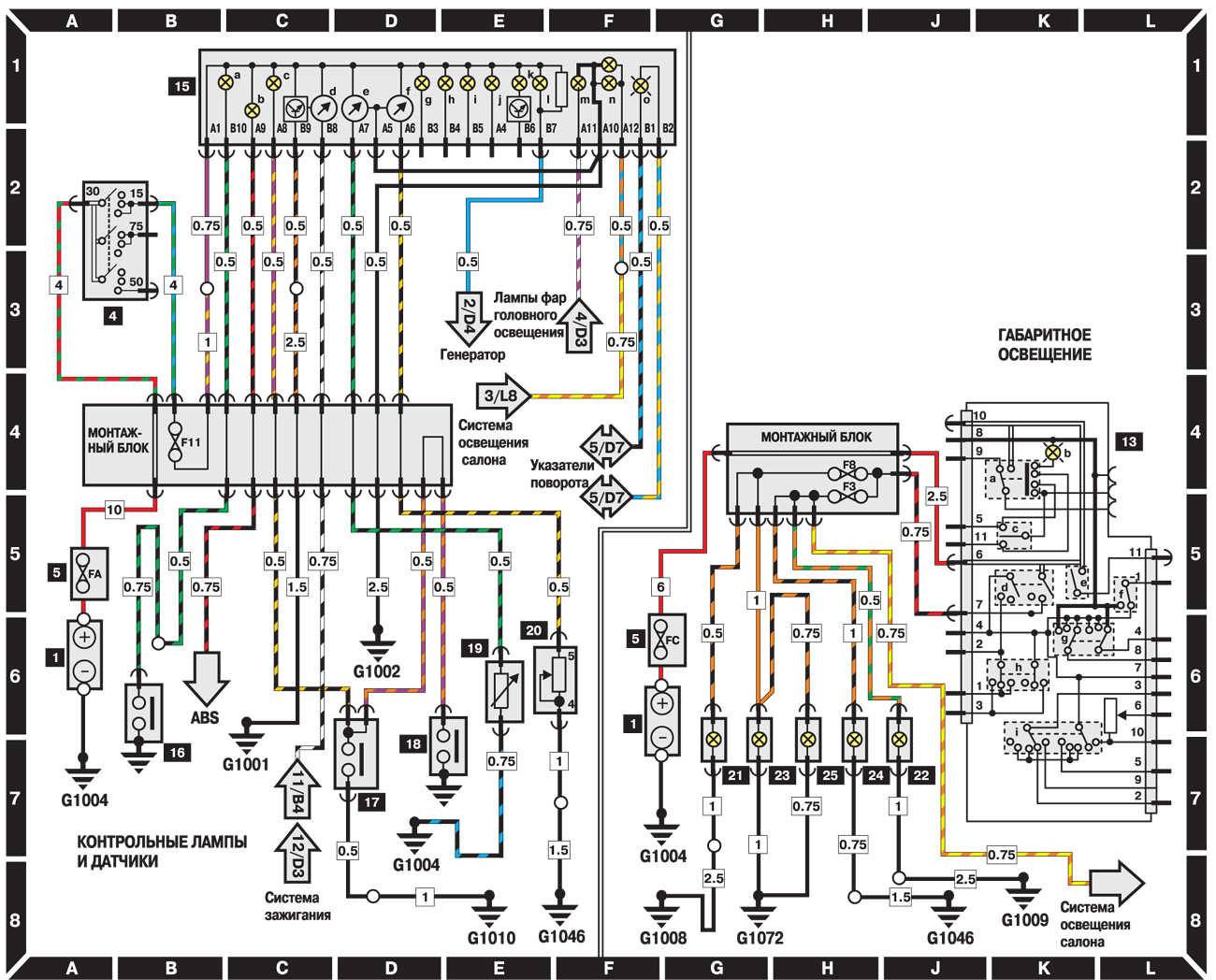 Эл.схема контрольной лампы и датчика, габаритного освещения