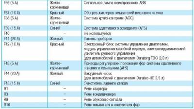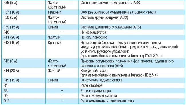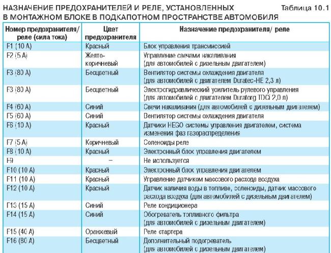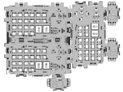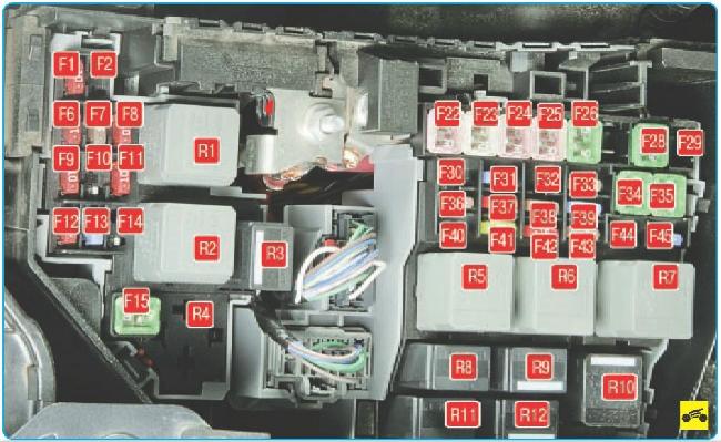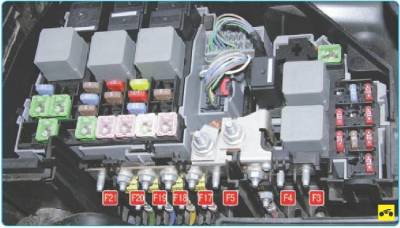 Расположение предохранителей и реле в монтажном блоке, установленном в подкапотном пространстве