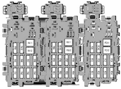 Расположение предохранителей в заднем монтажном блоке, установленном в багажном отделении автомобилей с кузовами седан и хэтчбек