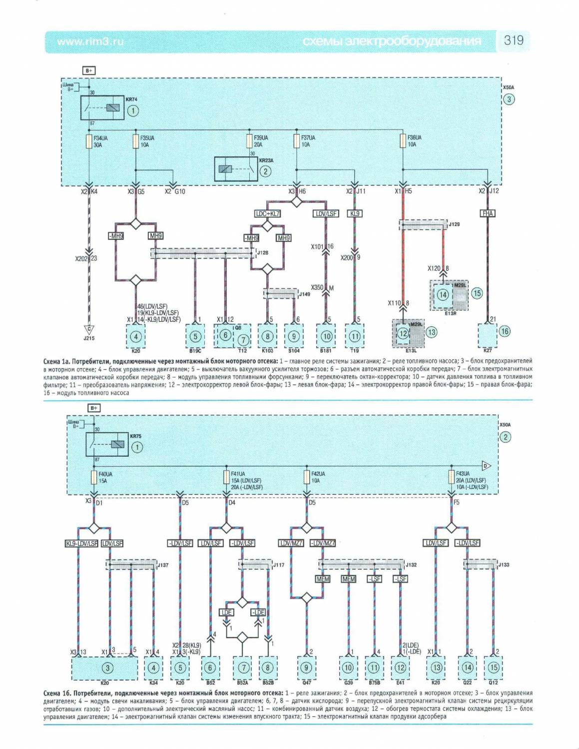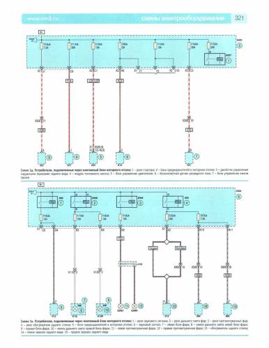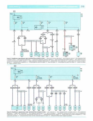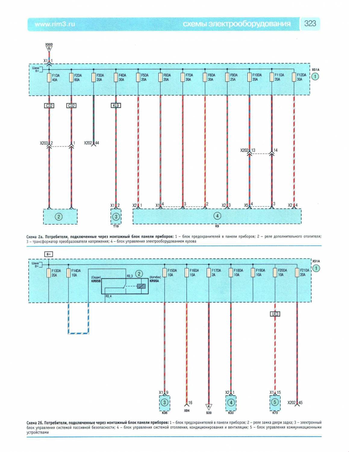 Электросхема потребителей, подключенных через монтажный блок панели приборов и противоугонной системы