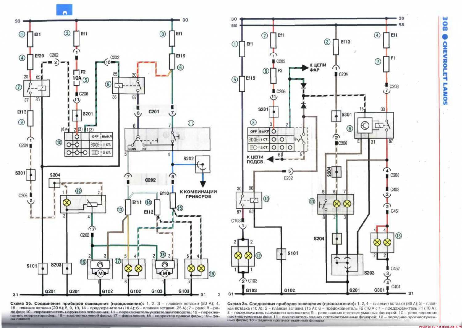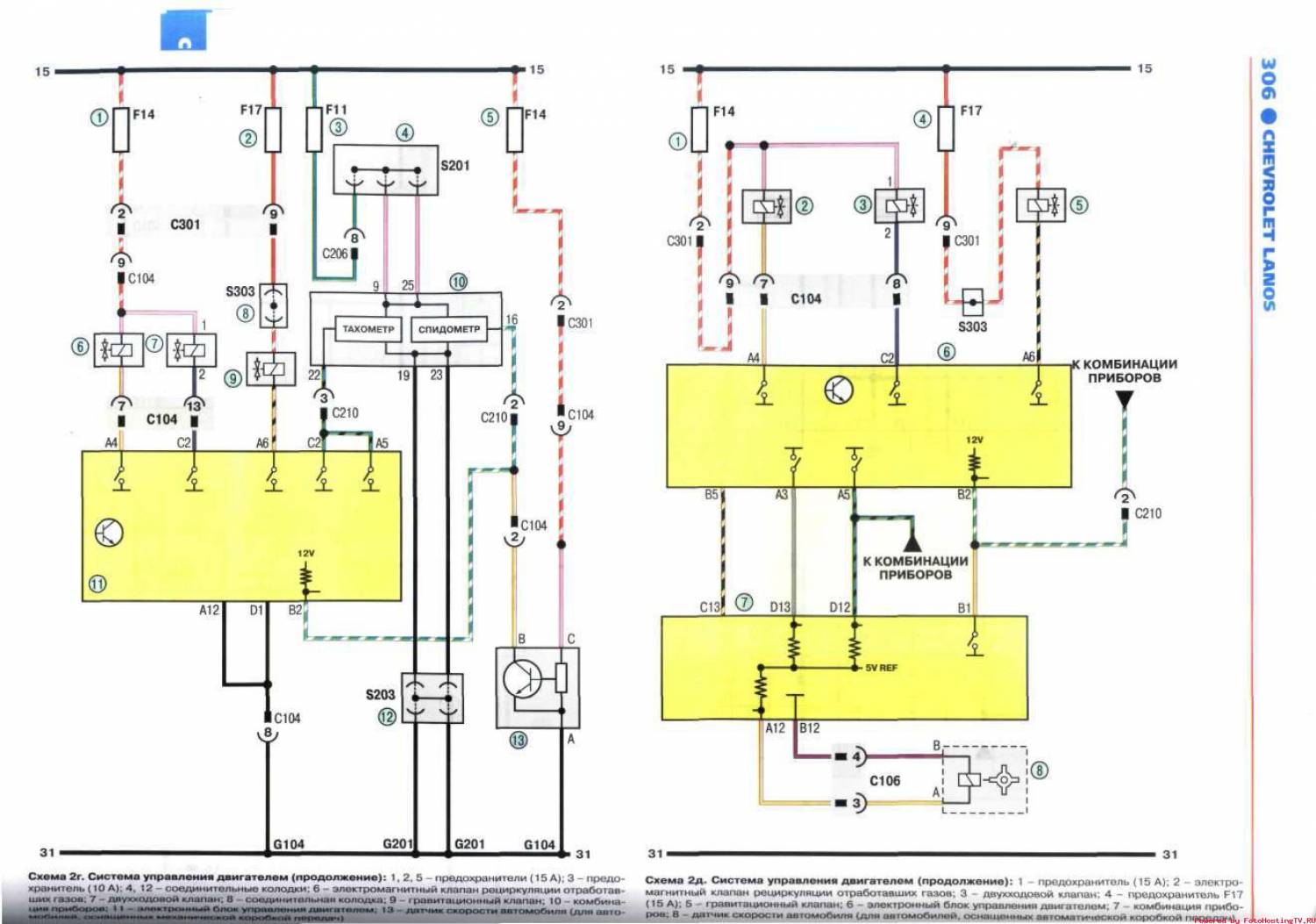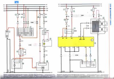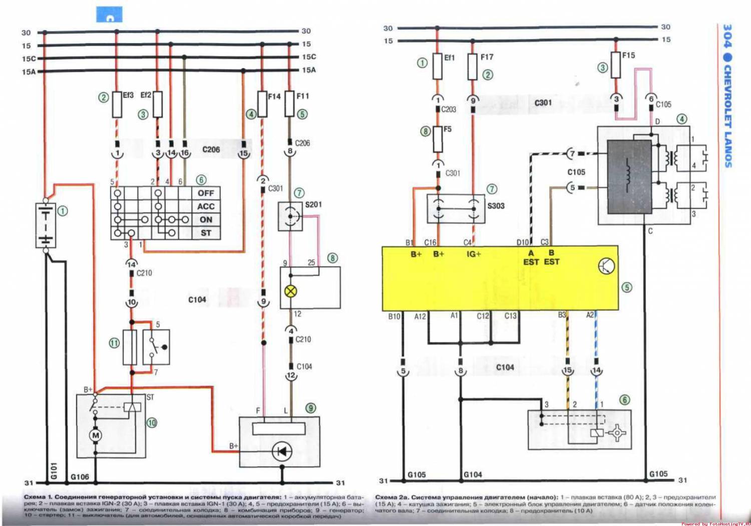 Схема генераторной установки, пуска двигателя, управления двигателем и соединения приборов освещения на Шевроле Ланос