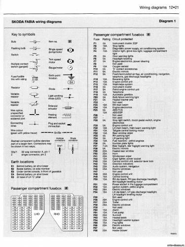 Ниже разместились всевозможные схемы электрооборудования на Skoda Fabia с 2000 по 2006 г.в. Шкода Фабия имеет полностью автоматический электронный климат-контроль, всё что нужно сделать — это выставить нужную температуру. Система сама определяет необходимую температуру воздуха, направление и силу обдува, идет как дополнительный апгрейд. Для женщин, в новой Skoda Fabia, предусмотренно столько отсеков для мелких вещей, что можно забыть, где вы эти вещи оставили. Эти отсеки практически везде: в передней панели, дверных отсеках, где легко умещается полторашка воды, под передними сиденьями, в спинках передних сидений, в центральной консоли и в различных отсеках багажника.