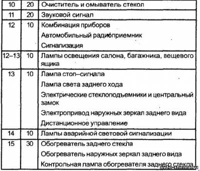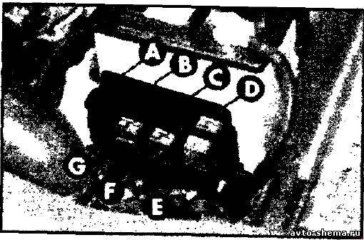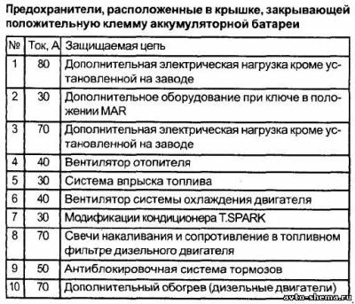 Схема расположения предохранителей, находящихся в крышке, закрывающей положительную клему аккумуляторной батареи